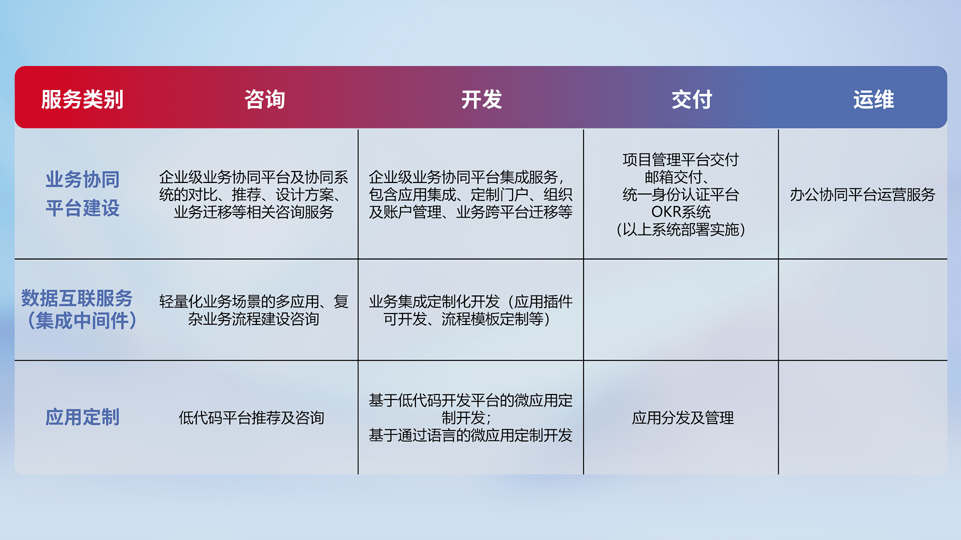 针对钉钉、、、、企微、、IDaas等平台级产品提供产品的规划、、、、方案、、交付、、、定制化开发等服务,,,,实现如统一协同办公、、、智能客户服务、、混合会议管理、、、智能数据查询、、等业务场景,,实现数字化转型。。